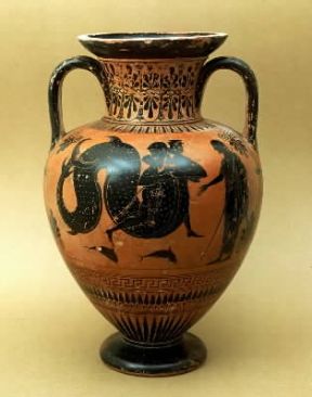 Ercole e Tritone rappresentati in un'anfora a figure nere proveniente da Selinunte (Palermo, Museo Archeologico).