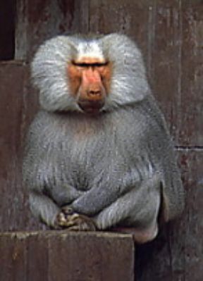 L'amadriade mostra un'organizzazione sociale ben precisa fondata su gruppi numerosi (normalmente 50-100 individui, ma a volte anche fino a 400), a loro volta suddivisi in gruppi più piccoli, costituiti ognuno da un solo maschio adulto, da una o più femmine adulte e dai loro piccoli fino a un anno e mezzo d'età. Nell'ambito di questa unità sociale di base le relazioni tra individui sono stabili; il maschio adulto è il centro di attrazione delle femmine e le controlla strettamente: se una si allontana è sufficiente che il maschio protenda verso di lei la testa o, se intrattiene rapporti con un maschio estraneo, la aggredisca mordendola sulla nuca per farla tornare. I maschi piccoli, giovani e subadulti, invece, non sembrano soggetti al controllo dell'adulto e formano gruppi di gioco con tutti i membri coetanei dei grandi gruppi, più similmente ad altre specie di babbuini. Intorno ai tre anni, i maschi mostrano interesse per i piccoli e, in genere, per gli individui più giovani di loro, incluse le femmine, li rapiscono e li vezzeggiano; con le femmine, che sono assai precoci, però questo atteggiamento viene progressivamente sostituito dal morso alla nuca e sul dorso e un comportamento di tipo sessuale prende il posto di quello materno di vezzeggiamento. La femmina giovane, dal canto suo, segue il maschio proprio come fa la femmina adulta e da quel momento essa entra a far parte dell'unità che il giovane maschio si va formando. Altri tipi di associazioni tra le amadriadi sono: A) la squadra con due maschi, di cui uno subadulto, con o senza femmine, e uno adulto con la sua unità. Il rapporto dei maschi subadulti con i maschi adulti sembra di vantaggio per i primi, che imparano dagli anziani come muoversi sul terreno per la ricerca di cibo, ecc. B) La banda di alcuni adulti con le rispettive unità. La distribuzione spaziale delle unità dei singoli maschi nell'ambito delle bande è simile a quella che si osserva fra i babbuini di savana; i maschi che costituiscono le bande si conoscono probabilmente fra loro e questo è un elemento di coesione, manifesto fra l'altro nella tolleranza reciproca, ma bande diverse a volte si combattono. C) Il branco per il pernottamento, formato da molte bande. Le amadriadi trascorrono la notte su rocce inaccessibili in branchi comprendenti fino a qualche centinaio di individui. In questi branchi, tuttavia, i membri delle singole unità non si mischiano, sicché la maggior parte degli scambi sociali avviene comunque fra i componenti delle singole unità. L'assidua attenzione reciproca che i maschi e le femmine di un'unità si scambiano può spiegare sia la scarsità di interazioni che la mancanza di aggressione fra membri di gruppi diversi. Infatti non appare un ordine gerarchico fra i maschi adulti dei gruppi che si riuniscono per dormire, e le femmine di unità diverse non si azzuffano, fatti abbastanza peculiari fra i babbuini. Parimenti mancano i gruppi di femmine che si osservano fra gli altri babbuini.