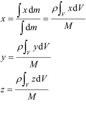 in cui Σ mi rappresenta la massa totale del sistema. In questo caso si parla di centro di massa, piuttosto che di baricentro, per quanto i due punti si possano considerare, in generale, coincidenti; nella trattazione successiva non si farà distinzione tra baricentro e centro di massa. Le relazioni date si estendono poi al caso di sistemi costituiti da distribuzioni continue di masse, sostituendo all'operazione di somma per un numero finito di punti l'operazione di integrazione, cioè di somma per un numero infinito di punti, considerati di massa infinitesima. Nel caso di corpi con densità costante (corpi omogenei) e gravità costante, si ha: