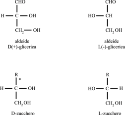 Negli zuccheri aventi più di un centro di asimmetria le espressioni D e L vengono riferite all'atomo di carbonio asimmetrico più distante dal gruppo aldeidico o chetonico. Tali simboli indicano la sola configurazione spaziale di carboidrati isomeri, ma non la loro attività ottica, espressa invece con i simboli + (=destrogiro) e-(=levogiro). Nelle prime formule di struttura, i carboidrati erano rappresentati da strutture lineari del tipo: