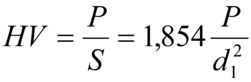 La prova di durezza HV viene effettuata usando un penetratore a forma di piramide a base quadrata con lato l uguale a 0,375 volte il diametro D della sfera tangente alla piramide nei punti medi dei lati di base e le cui facce formano un angolo di 136º. Così, con qualunque carico, si ottengono impronte geometricamente simili. Tale metodo è particolarmente indicato per materiali molto duri (data l'utilizzazione di un penetratore di diamante) ed è impostato sullo stesso principio del metodo precedente, cosicché la scala Vickers e la scala Brinell della durezza coincidono almeno per valori di durezza non molto grandi. La prova si esegue comprimendo il penetratore con un carico P prestabilito, di valore non superiore a 150 kg. Detta d₁ la media geometrica delle lunghezze delle diagonali dell'impronta, misurate con un sistema micrometrico, la durezza HV è espressa dalla relazione