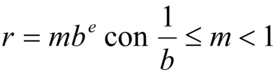 dove b è una base (che nel sistema binario con cui opera l'elaboratore vale 2, mentre nel sistema decimale vale 10). Per esempio il numero decimale 142,55 espresso in virgola mobile con base 10 è rappresentato da 0,14255·103 in cui +0,14255 è la mantissa e +3 è la caratteristica (se il numero è in modulo inferiore a 1, la sua caratteristica sarà negativa: per esempio 0,0039=0,39·10-2 in cui +0,39 è la mantissa e -2 è la caratteristica; se il numero è negativo sarà negativa la sua mantissa). In un elaboratore la rappresentazione di un numero in floating point viene effettuata nel formato seguente: i bit sono divisi in due gruppi e, partendo da destra verso sinistra, il primo gruppo è assegnato alla mantissa con il bit di segno a destra; il secondo gruppo è assegnato alla caratteristica con le stesse modalità. Per esempio, consideriamo una rappresentazione in semplice precisione, a 32 bit. In tal caso, numerando i bit da destra a sinistra: 24 bit sono utilizzati per la mantissa, di cui il 24° per il segno; 8 bit sono utilizzati per la caratteristica, di cui il 32° per il segno. Pertanto il numero in base decimale +14,5 che in rappresentazione binaria normale è +1110,1 in rappresentazione binaria floating point è: caratteristica 100, mantissa 0,11101. Nell'elaboratore esso sarà memorizzato come segue: