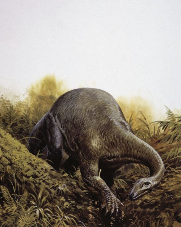 Plateosaurus, dinosauro vissuto durante il Triassico superiore in Europa Vissuto verso la fine del Triassico, Plateosaurus è uno dei dinosauri più antichi al mondo. Considerato uno dei più grandi rettili, misurava 8 m in lunghezza e 5,50 in altezza, possedeva coda e collo lunghi, testa piccola e ventre largo, presumibilmente atto a ospitare l’ingombrante intestino, necessario per digerire le grandi quantità di vegetali che l’animale staccava anche dai rami più alti degli alberi, ergendosi sugli arti posteriori.