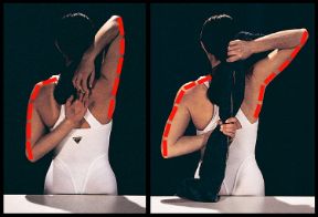 Esercizio per gli arti superiori. Movimenti per gli arti superiori da eseguire in piedi. Avambracci dietro il capo fino a toccare la scapola opposta.