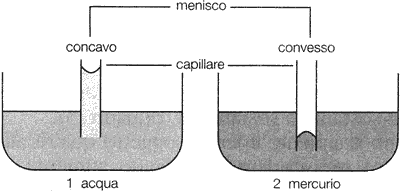 Nel primo caso, tipico dell'acqua, il liquido "bagna'' la superficie di vetro poiché le forze di adesione tra liquido e vetro sono maggiori delle forze di coesione alla superficie del liquido (dovuta alla tensione superficiale).